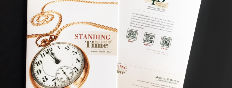This second one, for Medical Mutual, used the same emboss technique with a different subject matter – a pocket watch. We were able to get the watch and all of it’s chain links raised with a gloss UV to give it a golden metallic appearance.