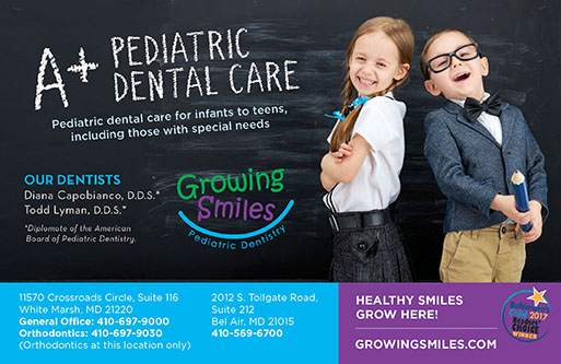 Growing Smiles, a pediatric dentistry in Maryland, wanted a series of ads to appear in a variety of publications. We at Main St. Design created fun, bright ads to reflect Growing Smiles client base. Check out some of our ads below, and keep an eye out for new ones in Baltimore’s Child, HoneyGo, and East County Times.
