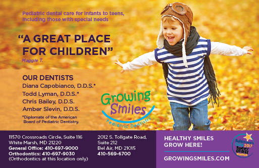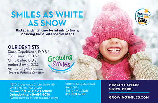 Growing Smiles, a pediatric dentistry in Maryland, wanted a series of ads to appear in a variety of publications. We at Main St. Design created fun, bright ads to reflect Growing Smiles client base. Check out some of our ads below, and keep an eye out for new ones in Baltimore’s Child, HoneyGo, and East County Times.