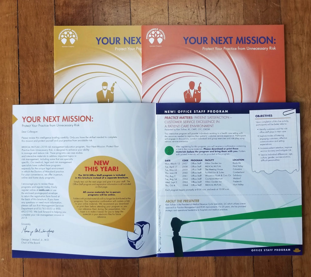 Below is a series of brochures given to members of Medical Mutual and Professional Advocate to promote continued education courses. This year’s theme was Spies. We believe these are best viewed with a martini, shaken not stirred.