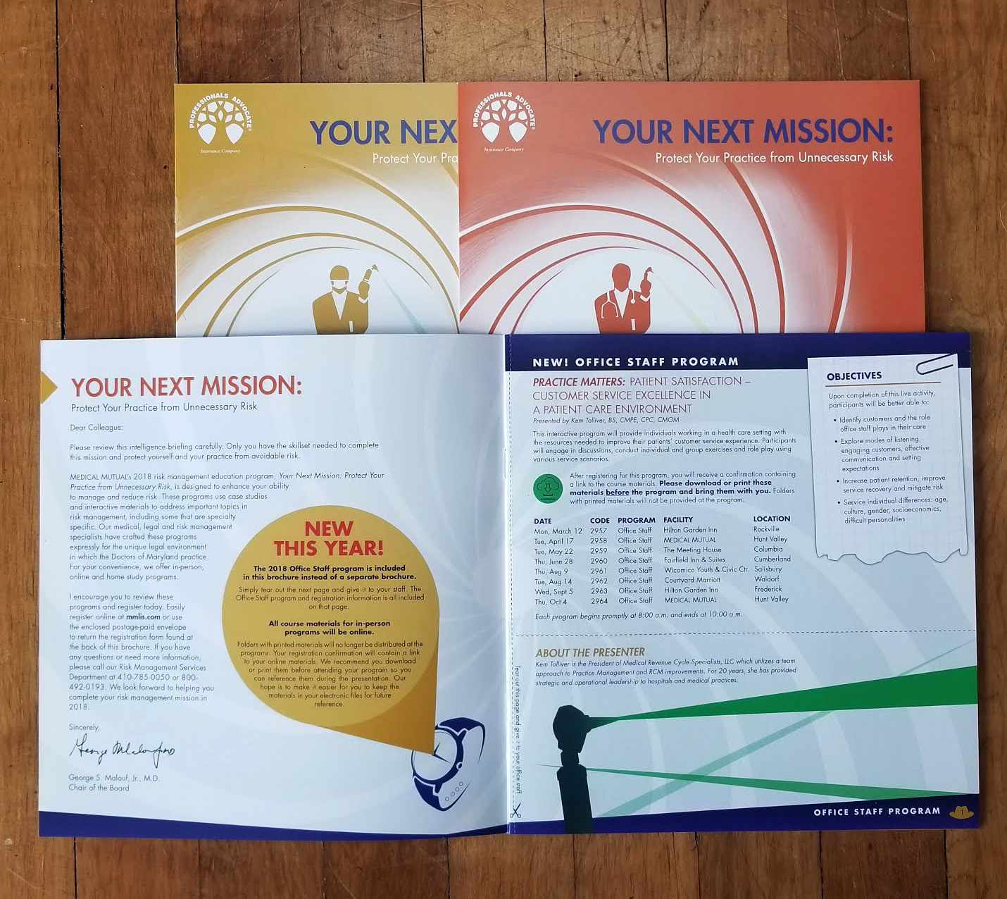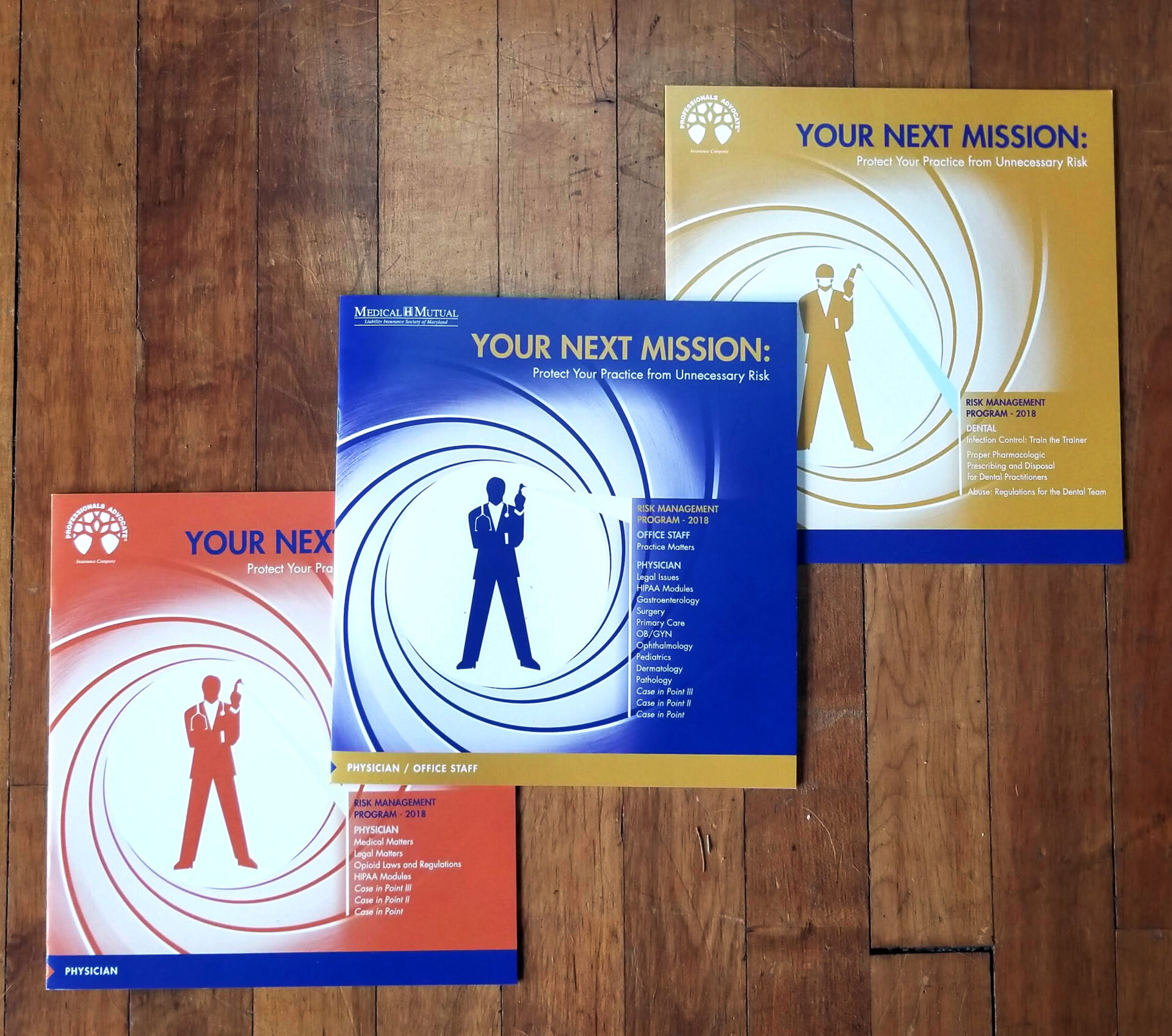 Below is a series of brochures given to members of Medical Mutual and Professional Advocate to promote continued education courses. This year’s theme was Spies. We believe these are best viewed with a martini, shaken not stirred.