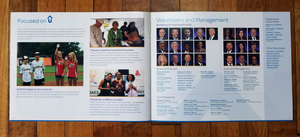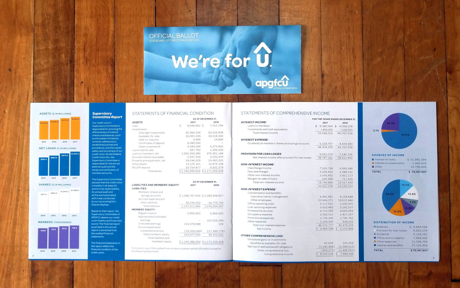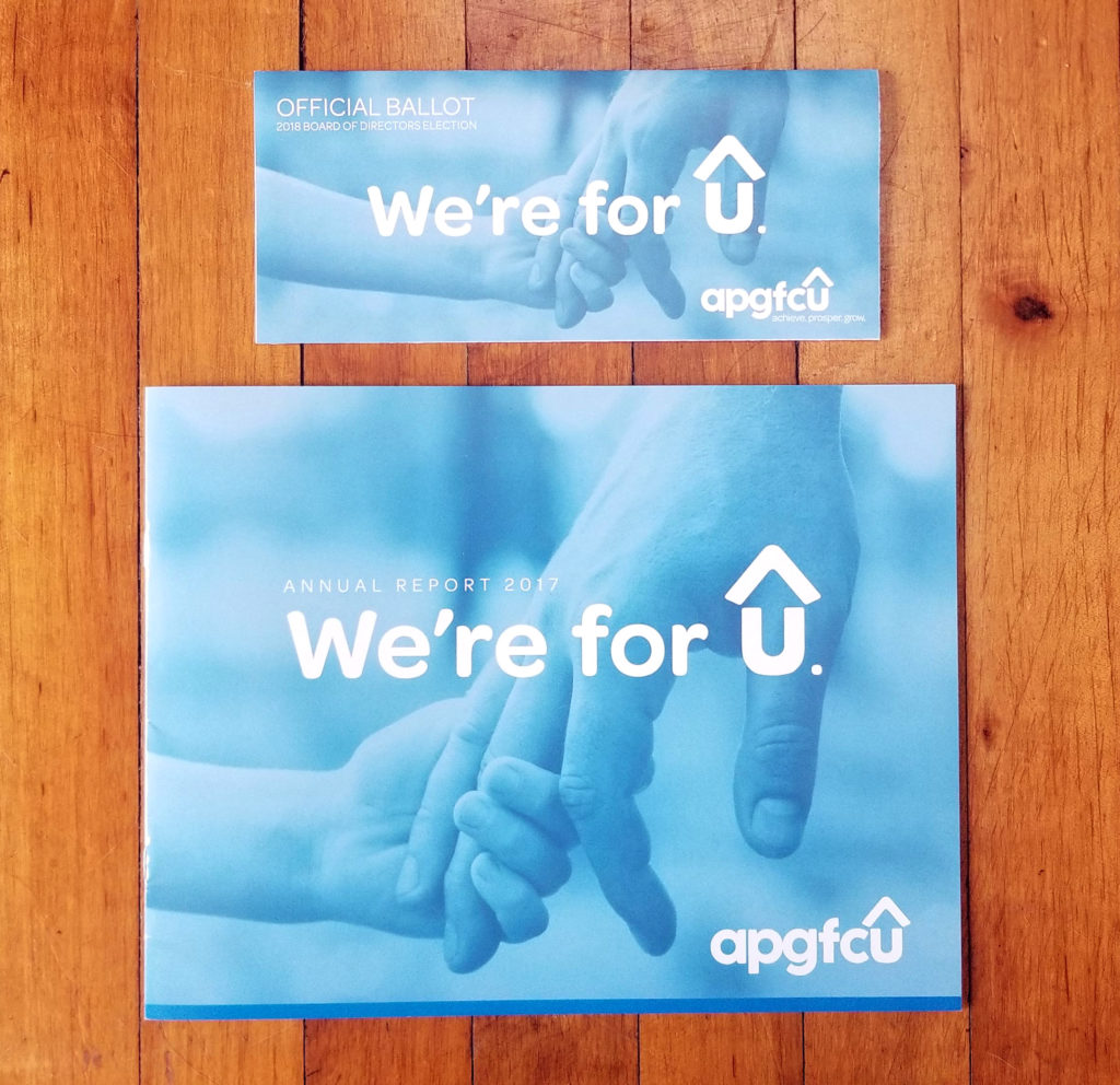 Aberdeen Proving Ground Federal Credit Union is one of the largest financial cooperatives in the area and is able to serve their members and communities as a trusted financial partner. In 2017 the Credit Union underwent a brand refresh. We at Main St. were happy and excited to introduce the new branding into their 2017 Ballot and Annual Report.