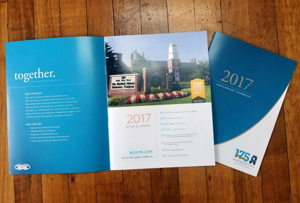 To conclude Harford Mutual’s 175th year of business, Main St. Design was asked to create an Annual Statement with a complimentary Year Book so Harford Mutual could document its fiscal year, and the exemplary employees that made this year a success.
