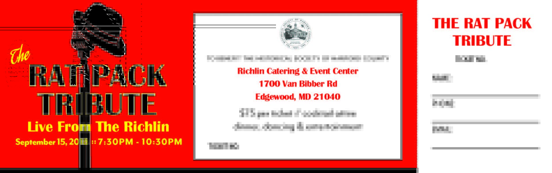 The Rat Pack Event, hosted by the Harford Historical Society, featured the music of Frank Sinatra and the Rat Pack. For this classy event, Main St. Design created Save the Dates, Flyers, Email Blasts and Tickets.