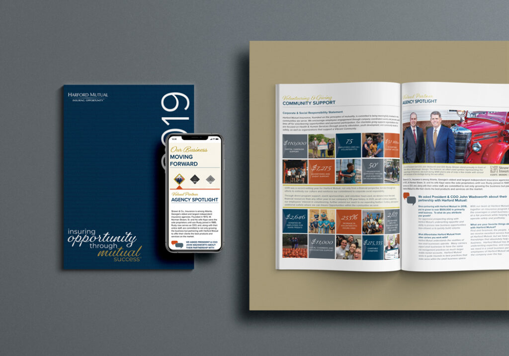 Harford Mutual returned to Main St. Design for their 2019 Annual Statement. Undertaking a huge challenge to update their brand, we were tasked with incorporating Harford Mutual’s new identity with some of their favorite things (white space, diamonds and their people!)