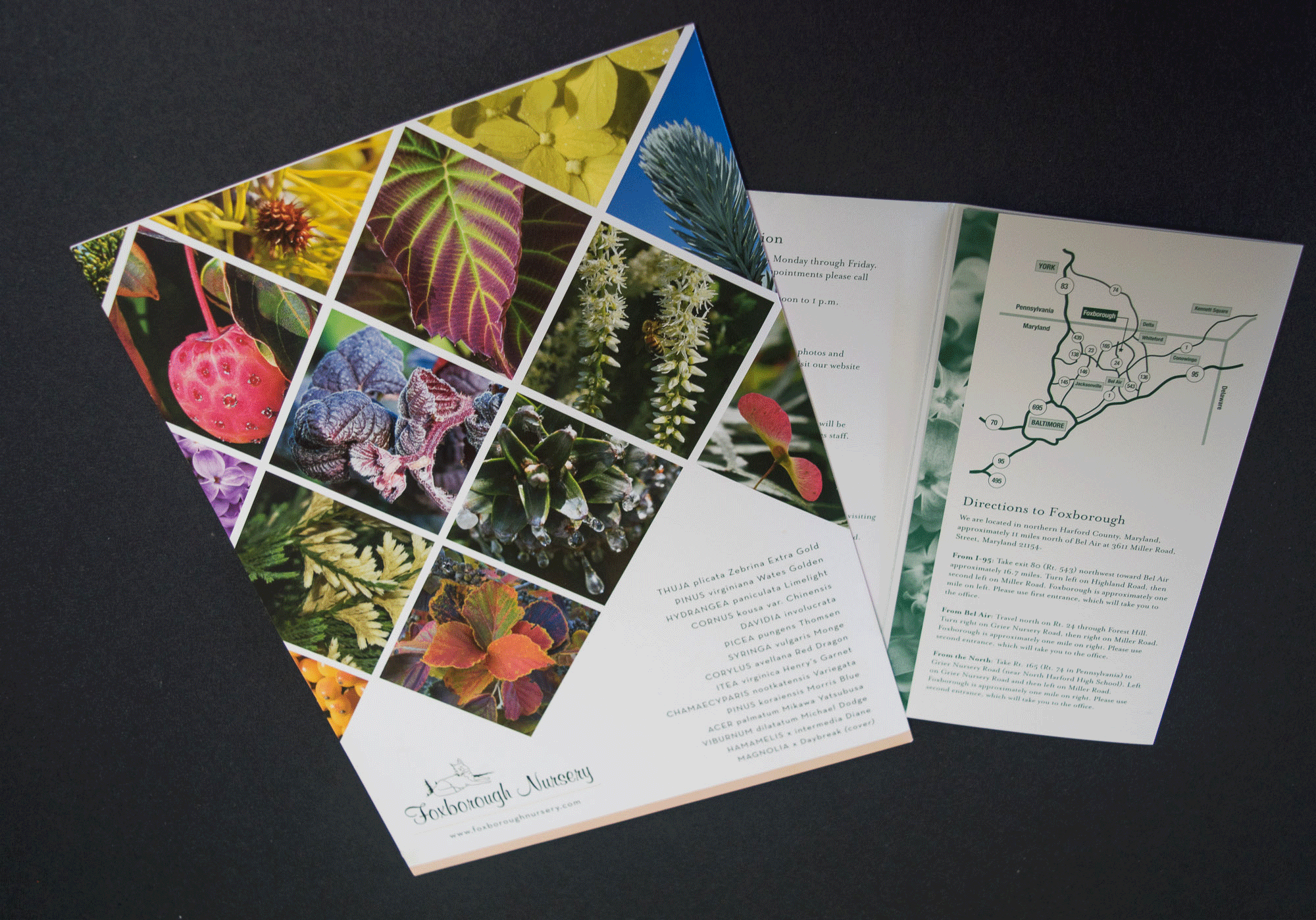 As the featured sponsor for the largest tradeshow in the industry, Foxborough Nursery was in need of a corporate folder and brochure to serve as holder for all of the materials collected at the show, as well as give the potential viewer a little information about Foxborough Nursery. Featuring actual specimens from the nursery, MSD created a pocket folder with a space inside to house a general brochure.