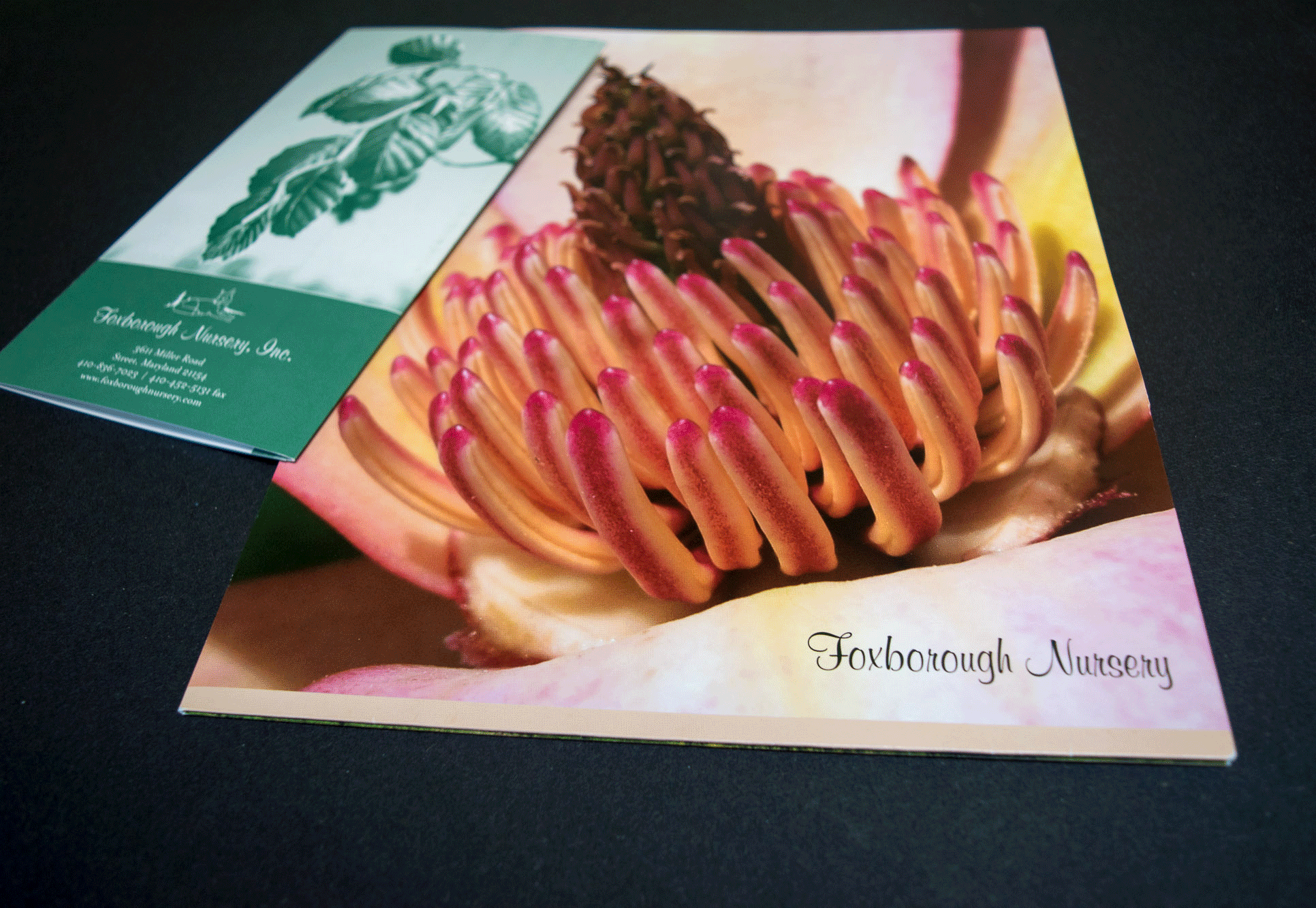 As the featured sponsor for the largest tradeshow in the industry, Foxborough Nursery was in need of a corporate folder and brochure to serve as holder for all of the materials collected at the show, as well as give the potential viewer a little information about Foxborough Nursery. Featuring actual specimens from the nursery, MSD created a pocket folder with a space inside to house a general brochure.